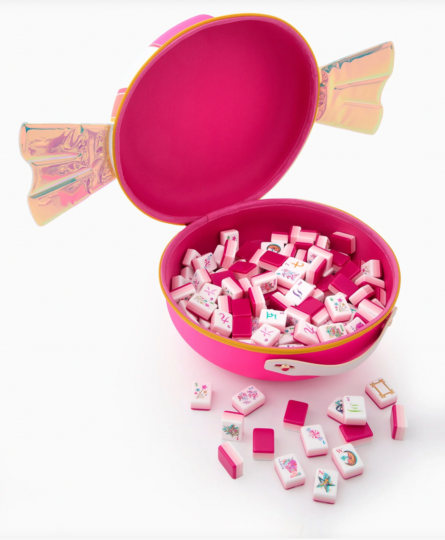 Playful, bright, and utterly whimsical, the Candy Tile Bag is a magical way to carry your Mahjong set. Made in vibrant hot pink, it features a single candy with delicate wings, adding a fun, fantastical touch to every game. Sized to fit a full set of tiles, this bag pairs perfectly with the Glitterville collection, making Mahjong feel as sweet and joyful as it looks.