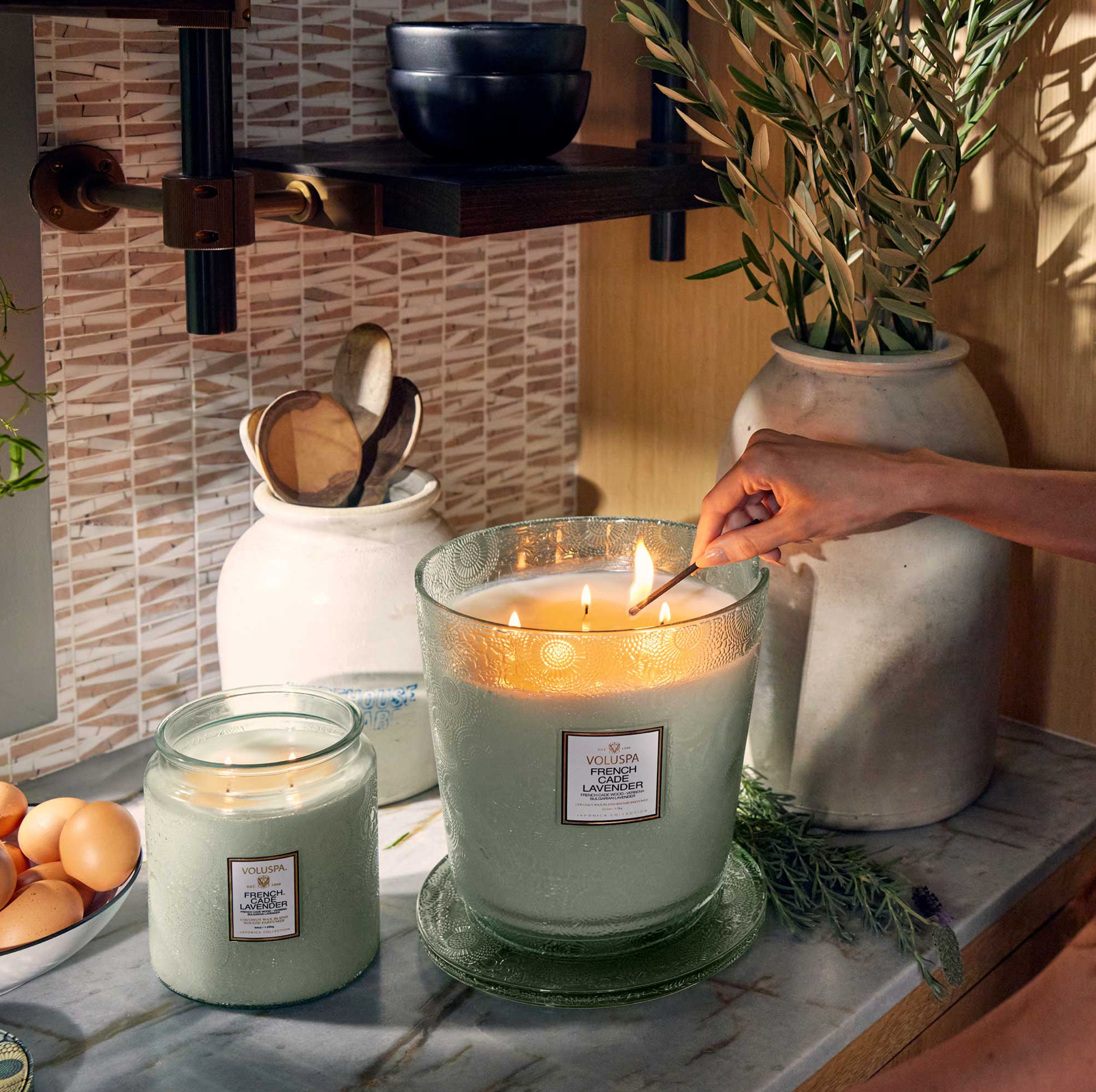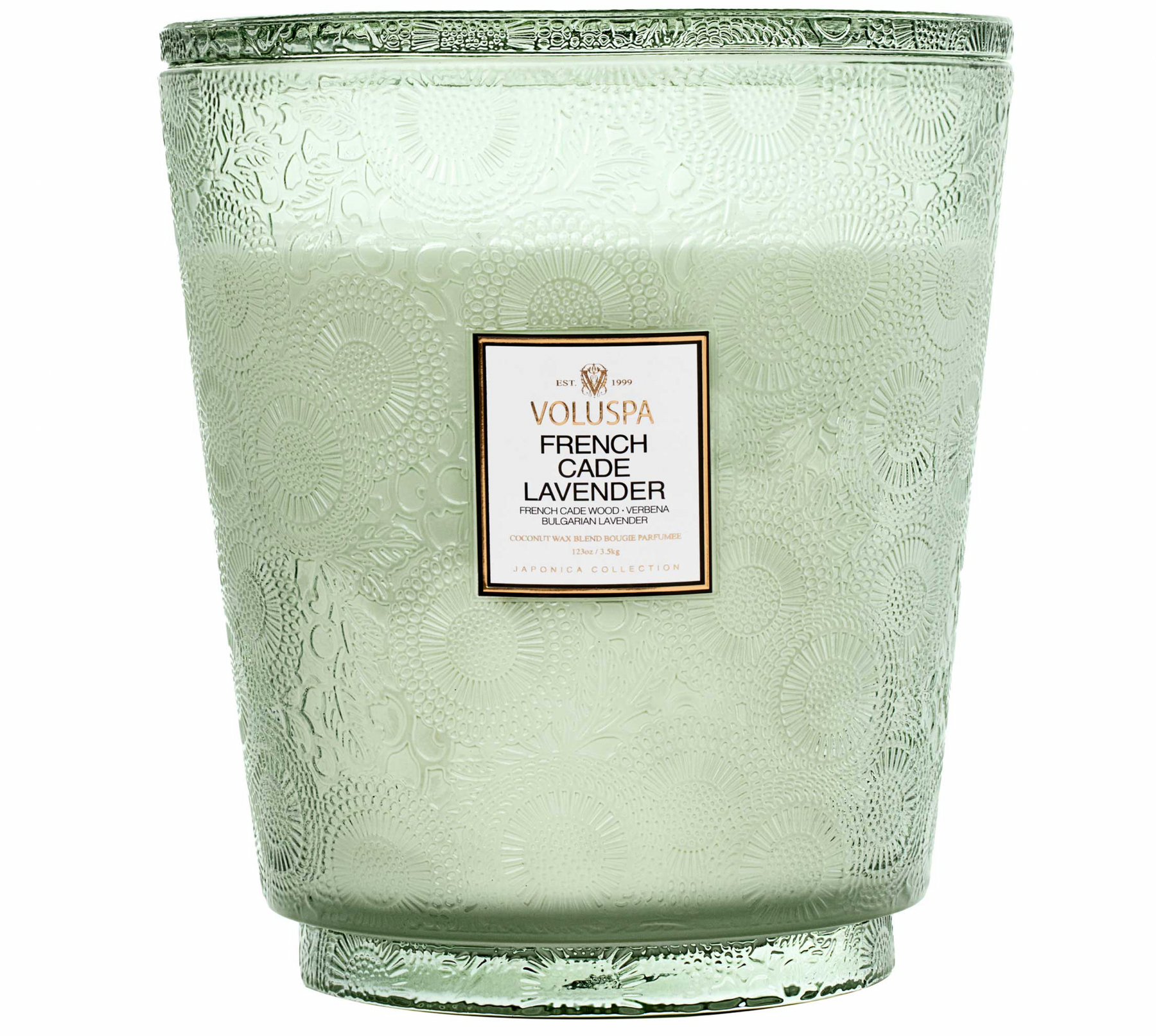 Voluspa's unique coconut wax blend is housed in a 123 oz. embossed glass vessel and topped with a matching lid that keeps the candle dust-free when not in use. Our five wicks allow you to enjoy fragrance throw for 250 hours. Our candles are handcrafted in the United States and feature our proprietary, clean-burning coconut wax blend and natural wicks. Our products are free of phthalates, pesticides, parabens and sulfates and are never tested on animals. Up-cycle this best seller into a keepsake after the last burn.